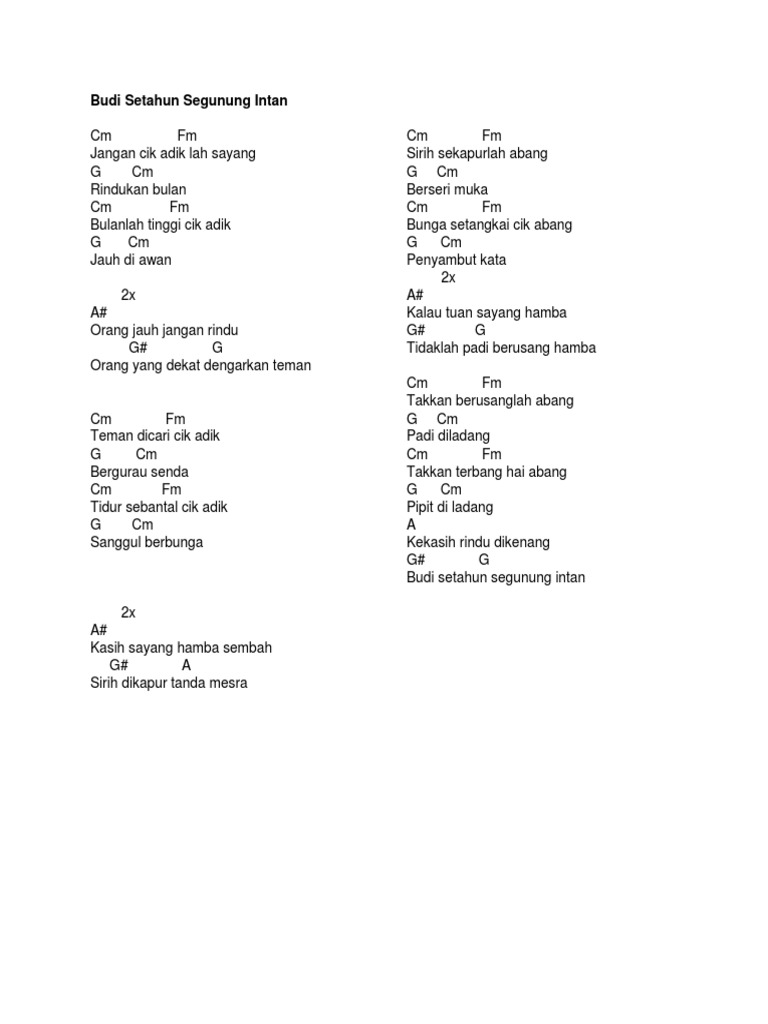 Lagu ini mengisahkan tentang 2 orang kawan rapat yang sebenarnya kedua-dua saling mencintai antara satu sama lain namun tidak pernah meluahkan perasaan masin. Dm G C F - Em Dm B E Am. Lama ku pendamkan F Em Dm sesungguhnya kau yang aku sayang E.